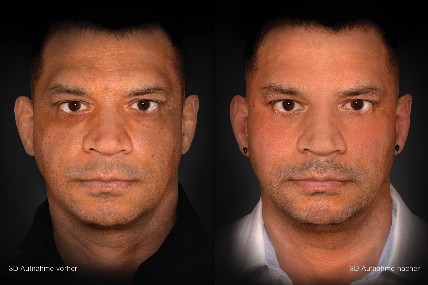Here, we show Manuel’s reflection via the 3D image. He shares that he’s often told he looks “stern,” even when he’s in a good mood. The forehead lines, frown lines, and crow’s feet, along with changes in contour in the forehead and cheek area, increasingly bother him. The sharp contour of his forehead and the volume loss in his cheeks make him appear less approachable than he really is.