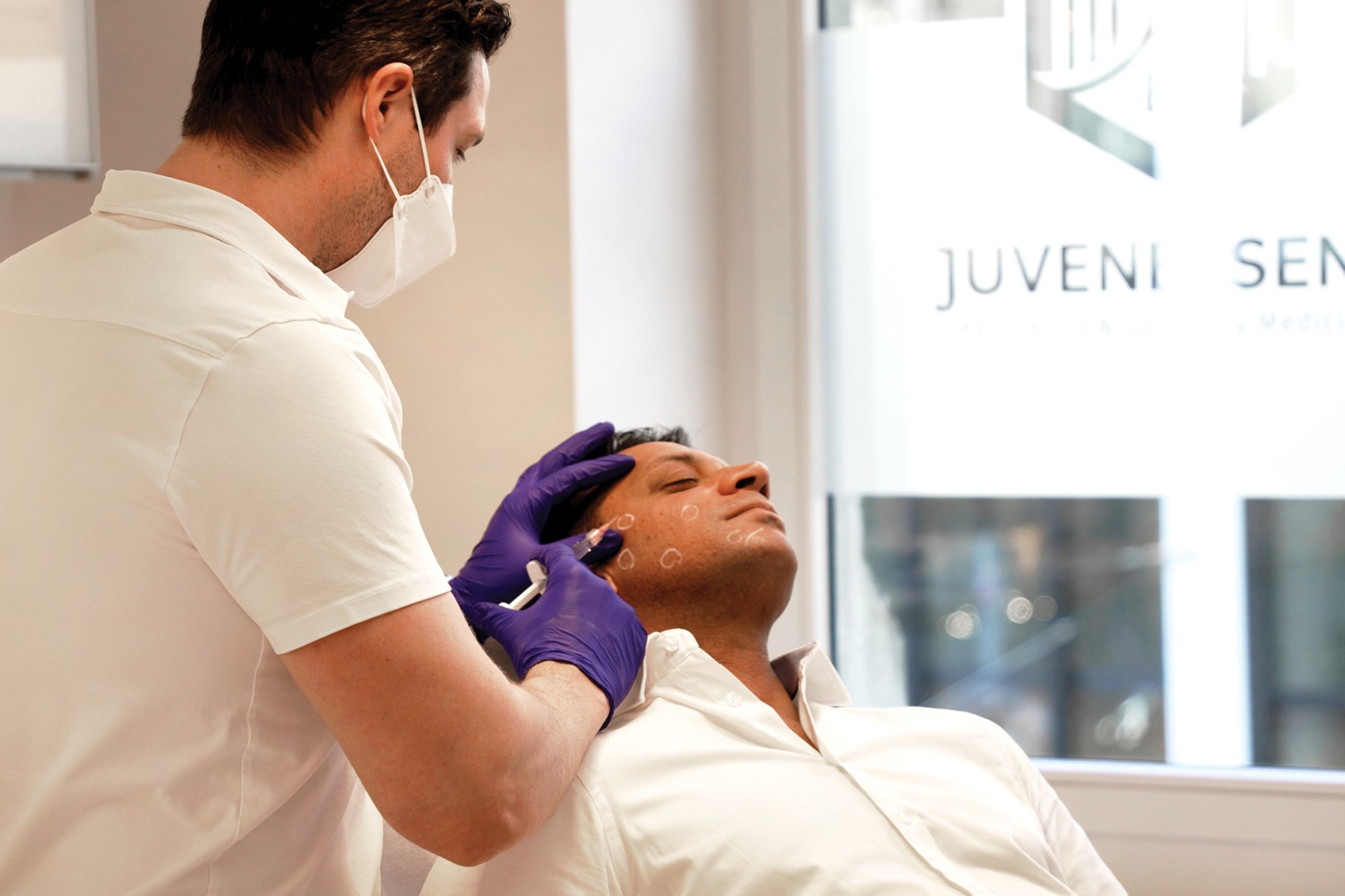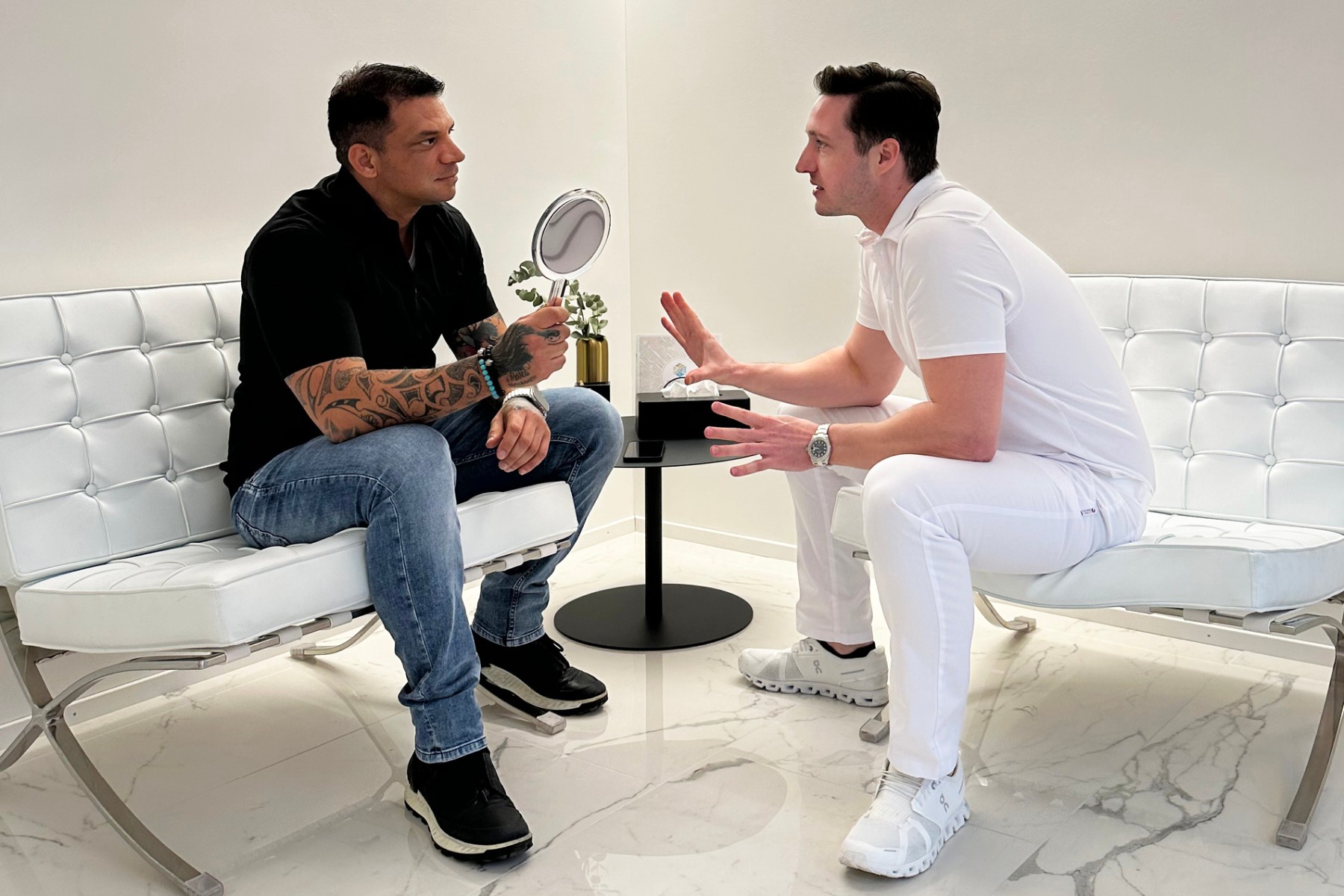 Manuel got in touch with Juvenessenz and scheduled a consultation with Dr. Thoele. During the first appointment, he shared that the wrinkles on his face were increasingly bothering him. Dr. Thoele also went through the Juvenessenz health questionnaire with Manuel to check for any health issues or risks that should be considered during treatment. The mirror plays an important role during consultations, allowing Dr. Thoele to precisely identify the wrinkles or facial changes Manuel is referring to.