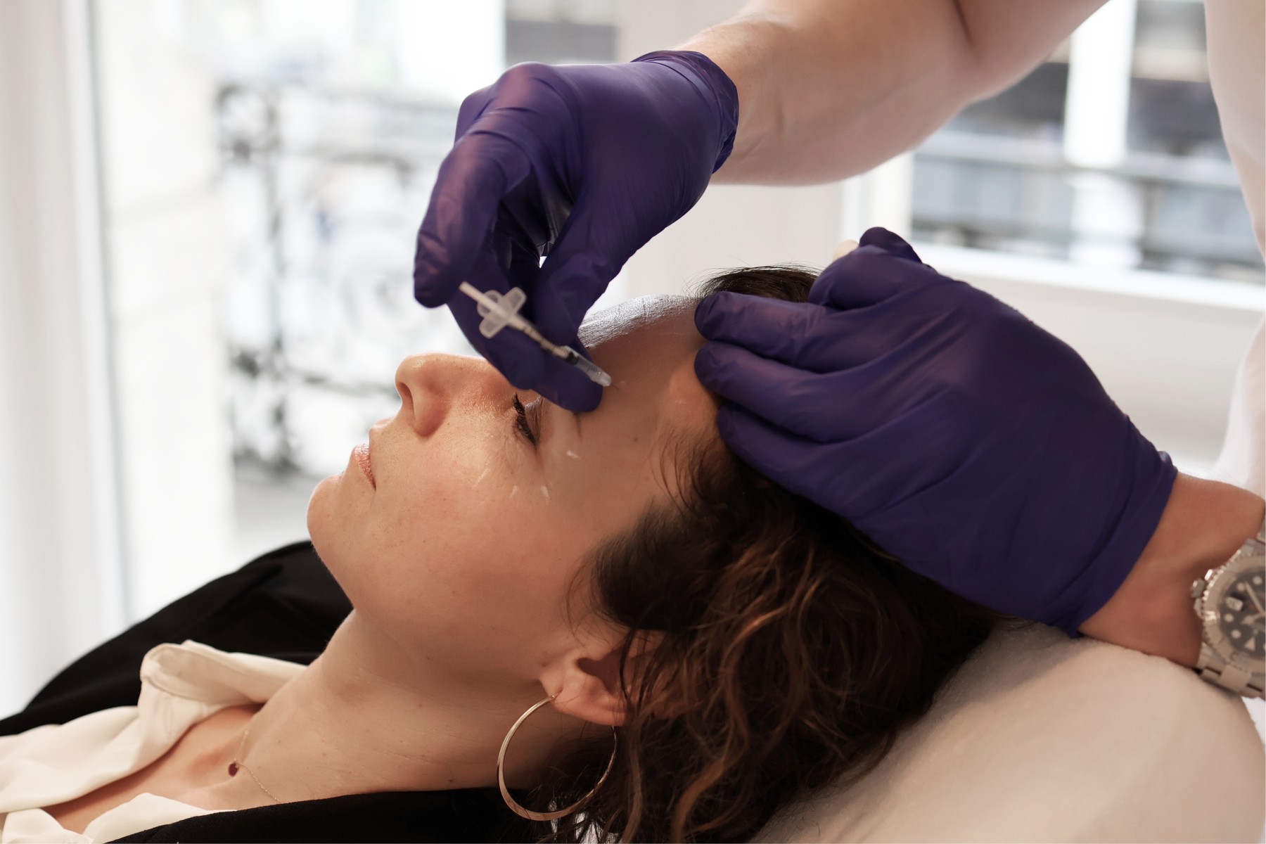 Vorsichtig wird die Behandlung zunächst im Bereich des oberen Gesichtsdrittels durchgeführt. Diana hat sich für die Behandlung aller drei Zonen entschieden. Dabei werden die Zornesfalte, die Stirn und die kleinen Fältchen um das Auge behandelt. Anschliesend wird noch der Kaumuskel beruhigt.