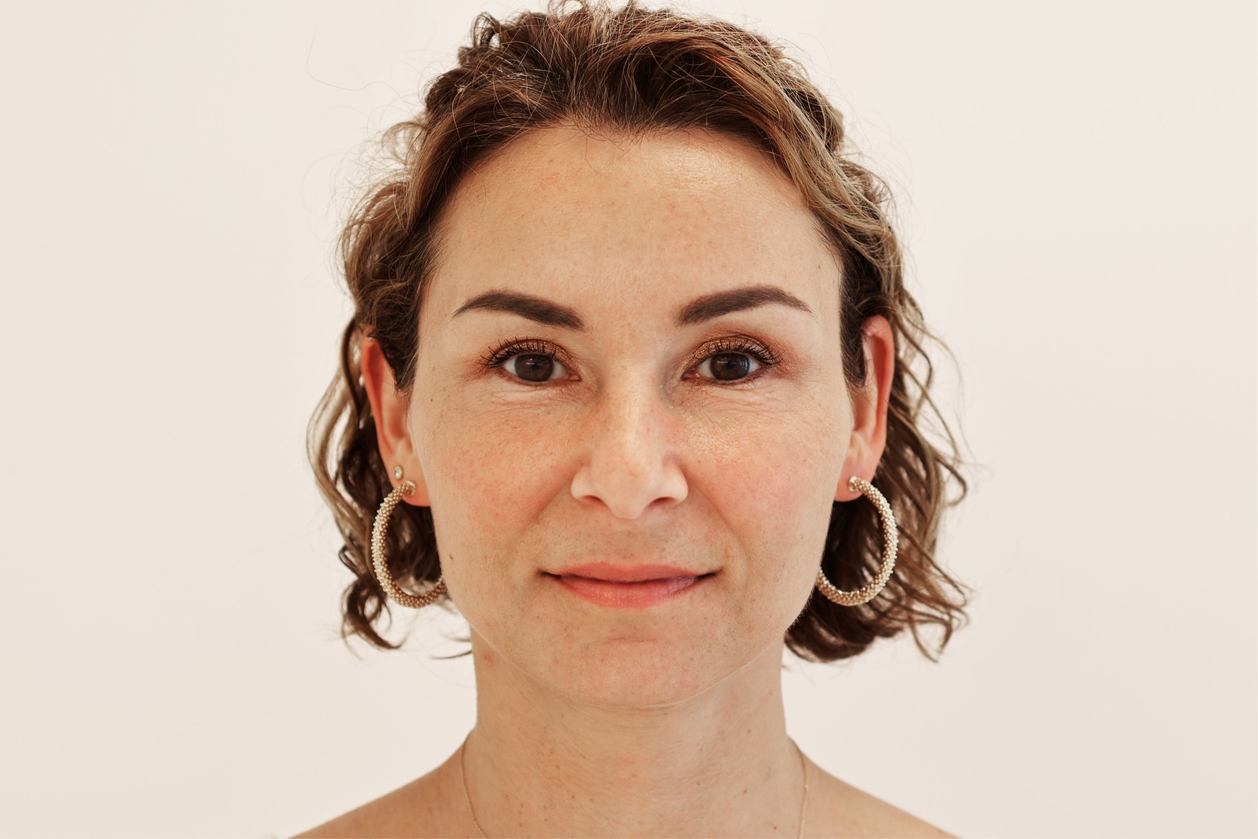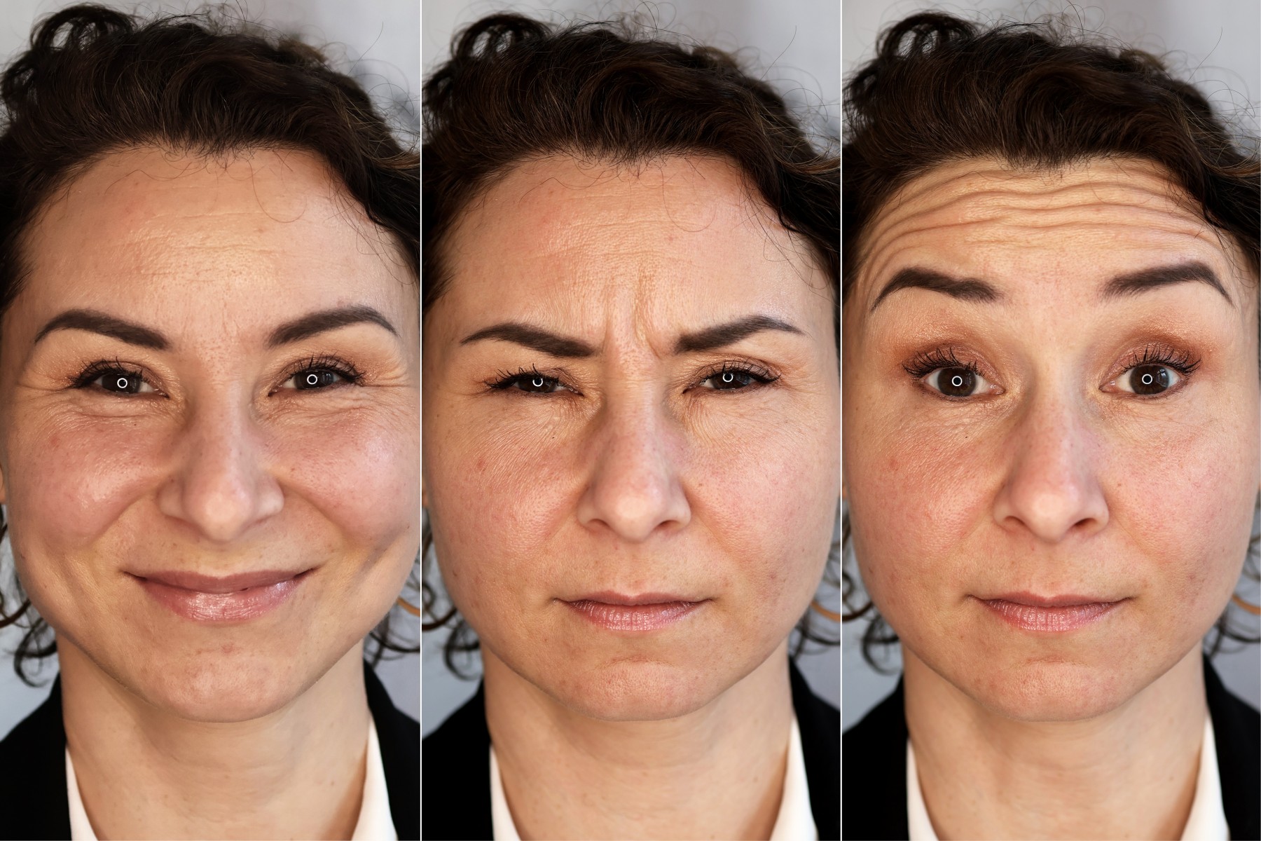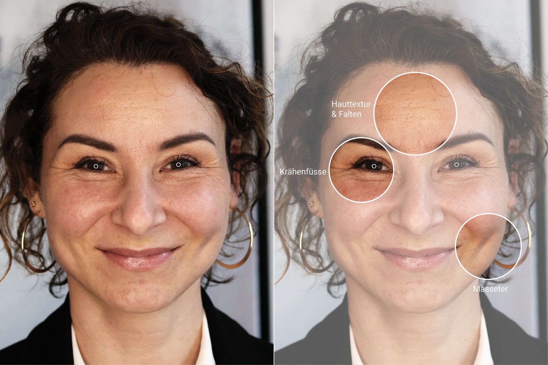 Diana has a youthful face, but the changes are clearly visible. Due to sun exposure and strong facial expressions, the skin on her forehead, around the eyes, and in the glabellar area has aged. Diana has also developed a rounder face because of jaw clenching at night, which has enlarged her masseter muscle. Her cheekbones have lost definition, and her face appears more rounded. These effects are especially noticeable when her face is in motion.