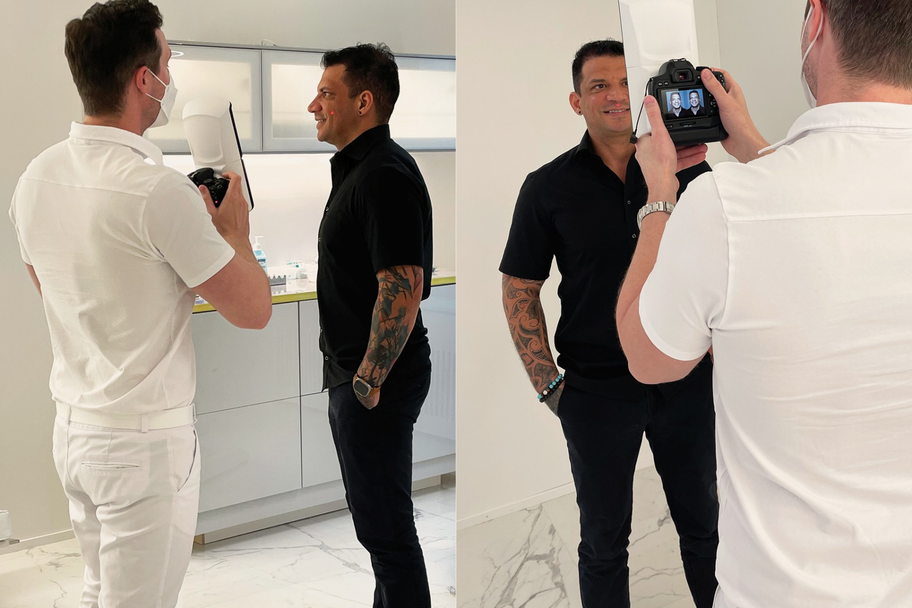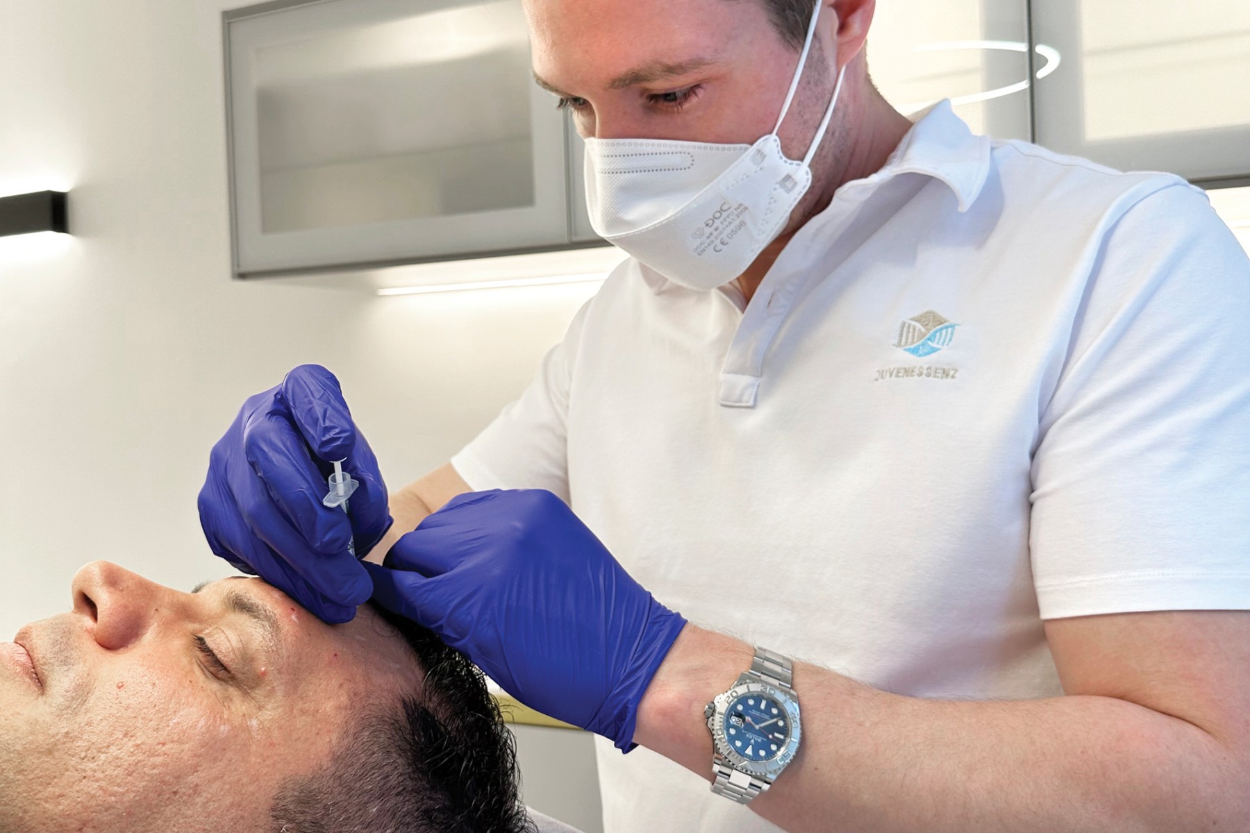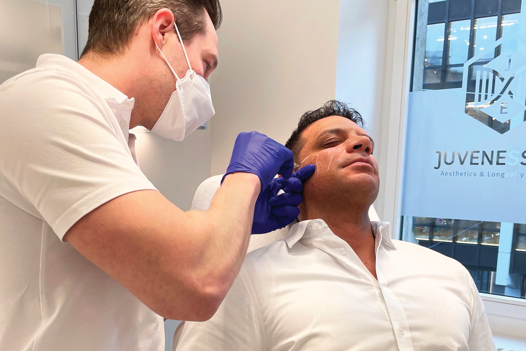 Manuel got in touch with Juvenessenz and scheduled a consultation with Dr. Thoele. During the first appointment, he shared that the wrinkles on his face were increasingly bothering him. Dr. Thoele also went through the Juvenessenz health questionnaire with Manuel to check for any health issues or risks that should be considered during treatment. The mirror plays an important role during consultations, allowing Dr. Thoele to precisely identify the wrinkles or facial changes Manuel is referring to.