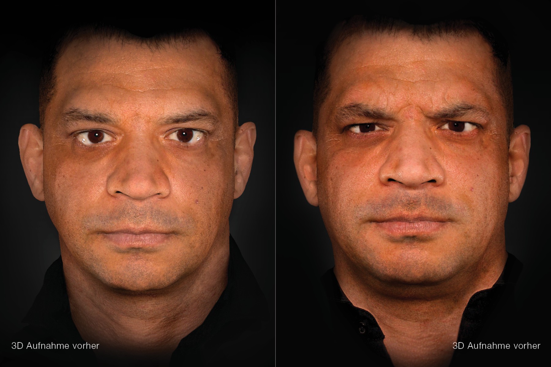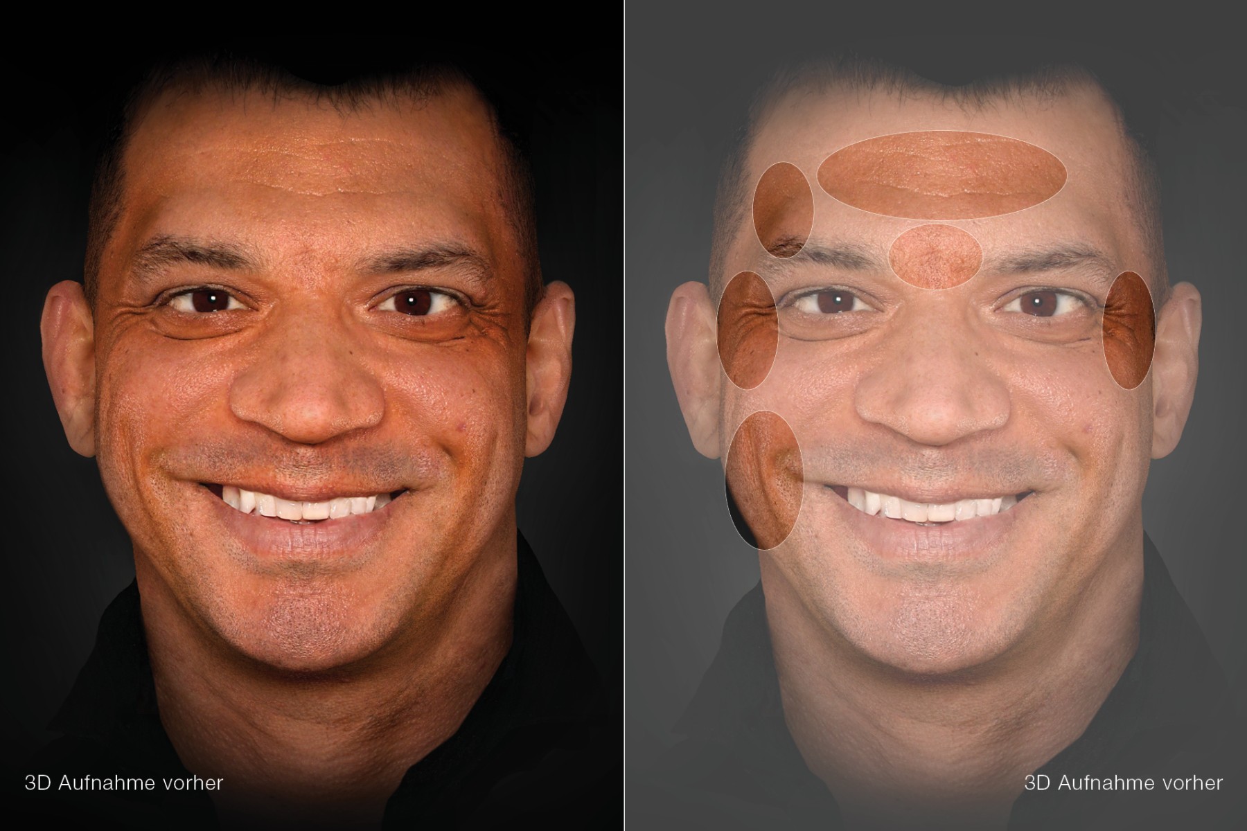 Here, we show Manuel’s reflection via the 3D image. He shares that he’s often told he looks “stern,” even when he’s in a good mood. The forehead lines, frown lines, and crow’s feet, along with changes in contour in the forehead and cheek area, increasingly bother him. The sharp contour of his forehead and the volume loss in his cheeks make him appear less approachable than he really is.
