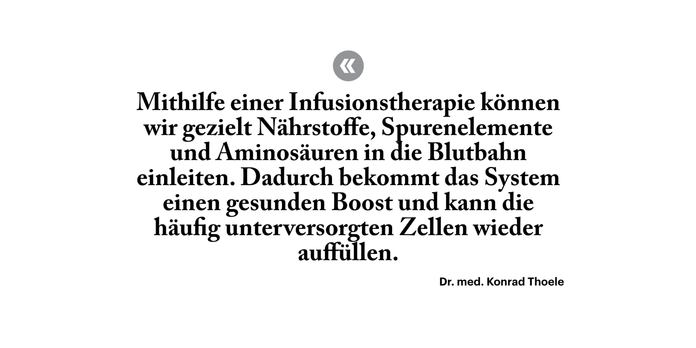Konrad Thoele: Mithilfe einer Infusionstherapie können wir gezielt Nährstoffe, Spurenelemente und Aminosäuren in die Blutbahn einleiten. Dadurch bekommt das System einen gesunden Boost und kann die häufig unterversorgten Zellen wieder auffüllen. In Abhängigkeit vom gewünschten Einsatzzweck werden die Formulierungen natürlich angepasst. Dabei geht es darum, die körpereigene Regeneration zu aktivieren. Wir umgehen die Magendarmpassage und die Limitationen des Mikrobioms. So können wir zum Beispiel die Nährstoffe zur Verfügung stellen, welche wir brauchen, um eine besser Gewebequalität bei Haut, Haaren und Nägeln zu erreichen, aber auch zur Entgiftung oder Stärkung des Immunsystems.